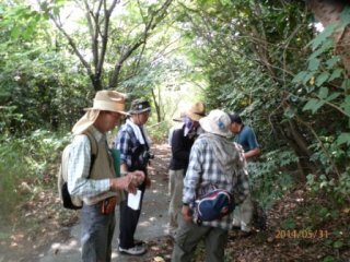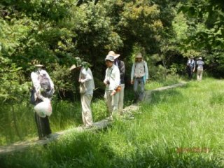 晴天で暑い観察会になりました。当日は他の観察会・行事と重なり参加者もいないのではないかと心配していましたが、まず〜の参加者になり内心ホッとしました。スタートして尾根道に入ると何となく樹木の臭いと気温の変化を肌で感じさせられる。昆虫で芋虫大好き女性の参加者がおられ、望んでいた虫を捕獲できたと大喜びされているのには全員が大喝さい(臭いの強いカメムシ類も部屋で飼っているとの事)。また、同種の樹木の仲間が沢山ある中でただ一本淋しそうに育っているクマシデにはビールの原料になるホップに似た花を数個つけ注目してくれと言わんばかりに皆を引き寄せる。予定では尾根を一周するコースにしていましたが参加者で足に負担がかかりそうな方が見えましたので、コースを変更し短縮して近道で湿地に入る。途中で見かけなかったイボタガも湿地内のネズミモチの木で数匹見る事が出来たがすでに角は付いていませんでした。ピンク色をしたトウカイコモウセンゴケの花が目立つなかナガエノモウセンゴケ(外来種)が広範囲に生えていることは心配である。ハッチョウトンボもまだ数は少ないが近くで見る事ができ初めて目にした方は‘ちっちゃい’と想像をはるかに超えているとビックリされていました。解散後時間も忘れ、幼虫の成長を絵にした観察記録を見せていただき感動(チョット観察に対する意欲も見直す事が出来た?)すると共に大変楽しい一日でした。(記・宮内)