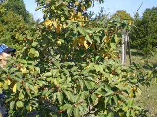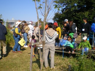 東邦ガスの楽しく分かりやすいビオトープや会社案内のビデオを見てから、本日の担当者が観察の諸注意をし、3グループに分かれてビオトープの観察に入った。知多市の天然記念物に指定されている、マメナシがありがたいことに狂い咲きしていて、花と実を同時に観察することができた。参加者は、「サクラみたいな花!」「梅のような花!」と口々に言っていた。小指の先端ぐらいのマメナシの実を見ると、名前の由来が説明しなくてもよく分かった。モンキチョウが1匹飛んでいたが、昆虫の姿はなかった。階段を上り、企業緑地の樹木の観察をした。以前の観察会と比べ、樹木が随分成長してい た。(記:吉房)(写真:大野)