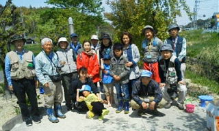 水温がまだ低いのではと心配したが、好天に恵まれ、4/14の下見より遙かに多くの生き物が見つかった。参加者の人数分会員が集まり、全員が色々な生き物を捕らえ、楽しい観察会となった。数日前に雨が降り、信濃川にはウシハコベ、コオニタビラコ、モリオニタビラコ等、春の野草が彩りを増していた。常連の参加者もいて、和気藹々のうちに採集を終え、金内さんの説明を熱心に聞き、家でも飼いたいと、参加者が思い思いに気に入った生き物を持ち帰った。最後に記念の集合写真を撮った。(記:吉房)