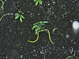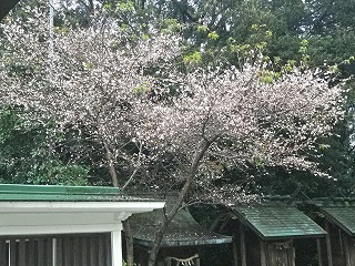 テイカカズラは、地面を這っているときには小さな葉をつけていますが、木に登るほど成長すると大きな葉をつける面白い種です。立派な実をつけているのを観察しました。また、境内には、シキザクラが満開でした。 (記:細川)