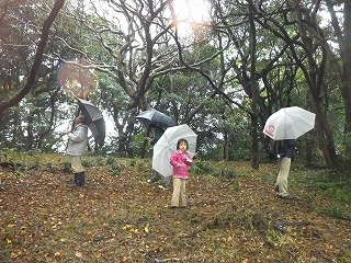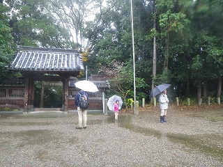 【左】雨の中の観察会     【右】強い雨を神社境内で避難