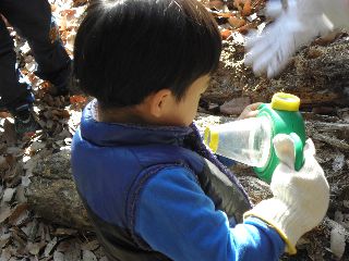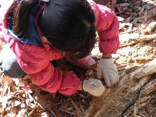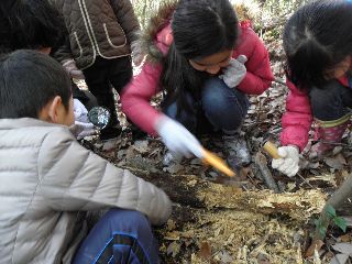 高根の森公園に集合。大人と子供が半々の参加者。遠くまでは歩かずに少し林の中をまわって始めの所にもどった。指導員が用意した椎茸のほだ木の朽ちかけたものを分解して木の中をのぞいた。はじまってすぐびっくりして飛び出したのはムカデ、成虫のユミアシゴミムシダマシ、寒いためか死んだように固まって動かない。進んでいくうちに、大きなカミキリムシの幼虫がざくざくでてきた。まるまるしておいしそう!キマワリの幼虫やユミアシゴミムシダマシの幼虫もみられた。コクワガタの成虫を3頭発見。日差しが心なしか柔らかく感じられ、少しづつ生き物の活動もはじまっていることが感じられた。(記・竹内秀 )