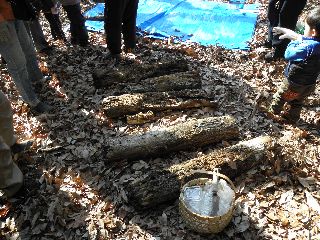 【左】シイタケのほだぎ 【中】いないかな 【右】クワガタ幼虫