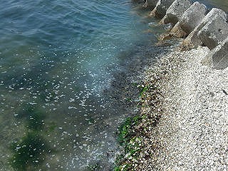 【左】クサフグが集まっています  【右】海水が精子で白く濁っています