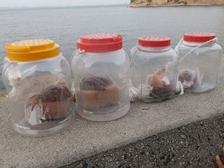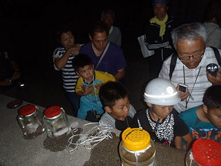19:30 きょうは、新月。あたりが真っ暗になって、お待ちかねの罠の引き上げの時間になりました。引き上げたビンの中には、何やら小さな生き物が活発に動きまわっています。