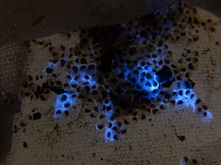 【左】瓶の中で泳いでいます              【右】刺激を与えると光りました!