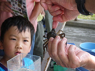 【左】婚姻色の出たヌマムツ 【右】モクズガニのはさみを観察