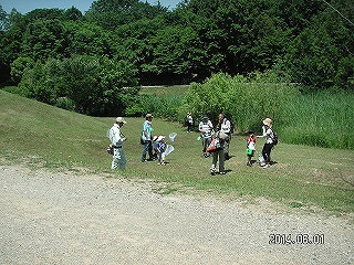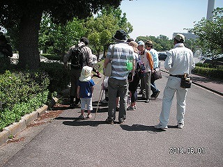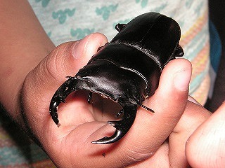 晴れて暑い日になりました。管理棟会議室で係員のあいさつの後、村瀬さんと吉川さんがコース及び注意事項などの説明を行いました。9:40から外に出て観察を開始しました。昨年同様「生き物たちの谷」を左回りに一周するコースを歩きました。管理棟から「谷」へ下りる坂道でナミテントウをよく見ました。坂道の途中の木陰でサクランボを試食しました。「谷」の周りでは子供たちがモンシロチョウやモンキチョウ、シオカラトンボなどを親御さんいっしょに追いかけました。「谷」の北の雑木林で3人の小学生が「オオクワだ。オオクワだ」と騒いでいました。私はどうせコクワ大型かヒラタだろうと馬鹿にしていました。ところがみんなが協力して木の穴の中から苦労して引きずり出したのは間違いなくオオクワ(写真参照)で一同びっくり、歓声が上がりました。私は反省しきりです。結局「オオクワの住める環境ではないことと牙の形が国産とは少し違うことから飼育されていた外国産だろう」という吉川さんの見解で決着しました。予定時間をオーバーし急いで管理棟会議室へ戻り、村瀬さんが見つけた生き物のまとめをして観察会を終了しました。(記・平松俊)