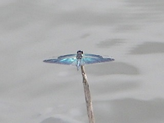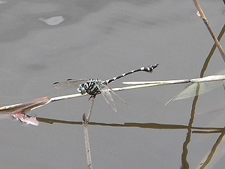 【左】チョウトンボ 【中】タイワンウチワヤンマ(蛇が寝池の水面を占有。外来の本種はウチワの形状が異る) 【右】ツクツクボウシ