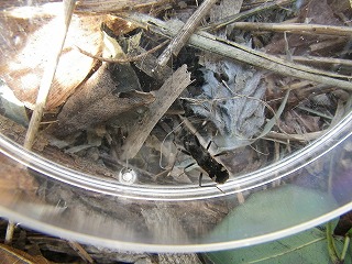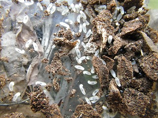 【左】コクワガタ(幼虫)の死骸 【中】アリの仲間とその卵 【右】キマワリ(幼虫)