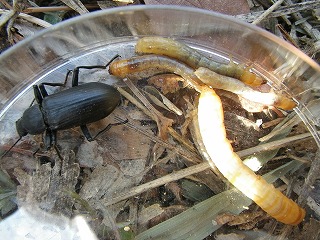 【左】ユミアシゴミムシダマシ(成虫・幼虫) 【中】コクワガタ(幼虫) 【右】カミキリムシ(幼虫)