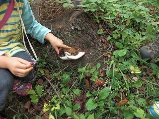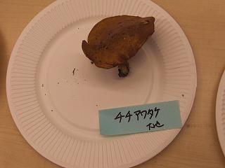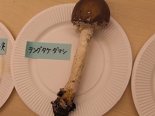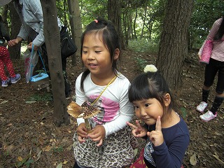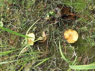 先週の台風18号のため運動会が今日に延び、予定していた参加者が減り、今日も台風19号が接近で心配したが、警報が出る前に無事観察会を行うことができた。 はじめに課長さんから公園内での注意があり、続いて村瀬さんがキノコの生態や観察するポイントについて説明をした。村瀬さんの袋から、本物そっくりのキノコのミニチュアが出てくる度に、参加者の目が輝いてきた。すばらしい動機付けである。キノコが少ないのではないかと危惧していたが、キノコ探しに入ると、子供の目線は低く、意欲的に次々とキノコを見つけていた。親御さんも童心に返り熱心にキノコ探しをしたお陰で、昨年より多くのキノコを見つけることができた。(記:吉房)