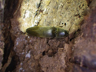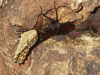 【中】お父さんがノコギリクワガタを獲り出す 【右】オオクシヒゲコメツキ