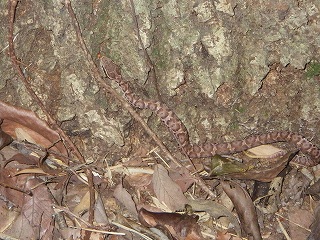 【左】ノコギリクワガタがいた 【中】トタテグモの巣があった 【右】マムシもいた