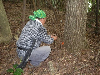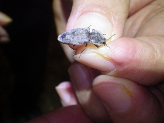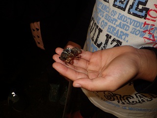 今年は、場所を変えて初めての灯火採集で、何が来るか期待の始まりでした。Facebookでの呼びかけも初めての試みで、なんと弥富から虫好きの一家がやってきました。正躬先生と下見してみつけたノコギリクワガタは夜までいて掴みあげると、下にメスがいてびっくり。子どもたちはバッタやセミ、カマキリなどを捕まえては体にくっつけたりして楽しんでいました。虫好き家族との観察会はとても楽しかったです。 (記:平松裕)