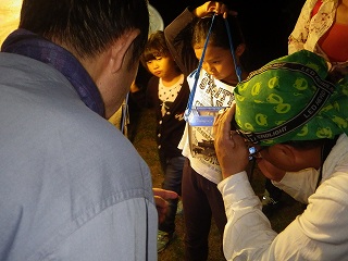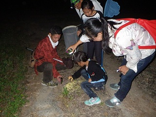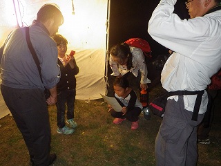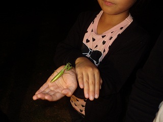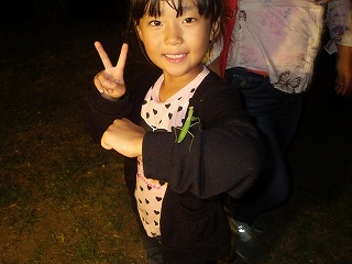 【左】昆虫大好き家族(4人)の前で始めのあいさつ 【右】ナイトハイク。キリギリスつかみに挑戦