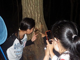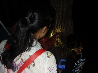 【左】ナイトハイク。トタテグモの巣(ふた)を説明 【右】ノコギリクワガタを観る(ちょっと、興奮ぎみ)