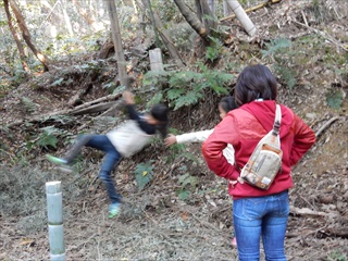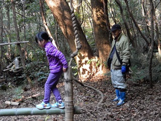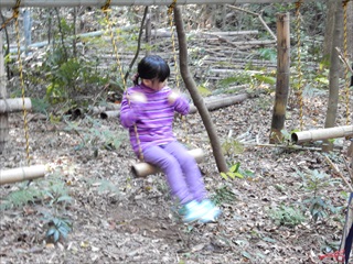 【左】ブランコ遊び 【中・右】竹渡り遊び。竹が動くので超むずかしい