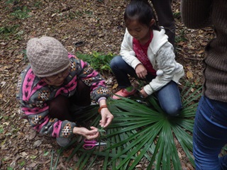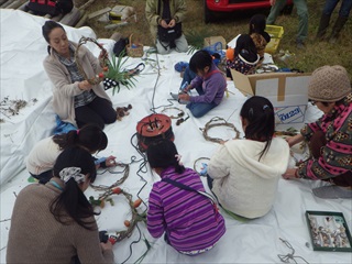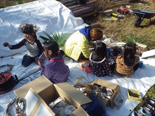 子どもたちは、竹林でブランコやターザンロープなどで遊んだり、シュロの葉で作るバッタや竹のパチンコにまん丸目玉でくぎづけになっていました。大人の参加者は竹林を散策していたみたいです。11時くらいから竹林を出て、リース作りを親子で楽しみました。少し時間は超過してしまいましたが満足してくれたみたいです。