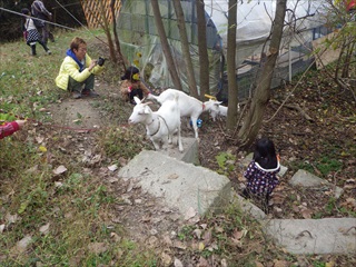 【左】始めの挨拶。林の中は、公園じゃないので危険がいっぱい… 【右】まずは、ヤギちゃん遊び