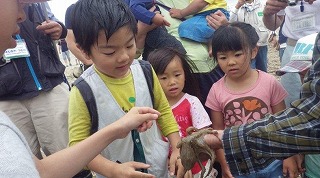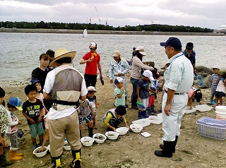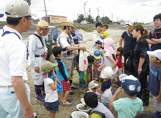 【左】タコ釣りに来た人にタコを見せてもらったよ 【右】熱心に聞き入っている子もいたよ