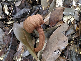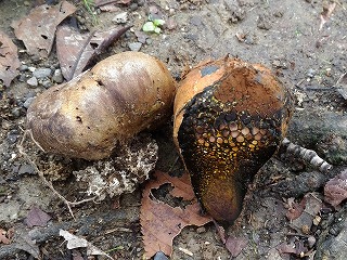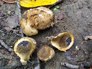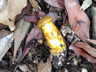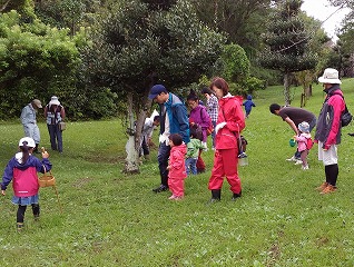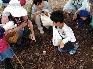 キノコ探しが始まると皆一生懸命。子供の目線は低いので、思いがけないところでのキノコまで探し出し、大人が驚くばかりである。観察会に参加する親御さんは自然に対する関心が強い方ばかりなので、子供達も日頃からその影響を受けていて、鋭い観察力を持っている。小さな子までが終わりの時間を告げるまで熱心にキノコ探しをしていた。1ヶ月近く天候不順だったせいか、全員が多くのキノコを採集することができた。最後に、皆で採集したキノコの名前や特徴等の説明が降幡さんからあった。ホコリタケを軽くたたくと胞子が埃のように舞い上がる様子に歓声が上がった。また、ヘビノキノコモドキの名前の由来は、柄が蛇の体に似ているからと聞くと子供達が興味深く見つめていた。動物がおしっこをしたところに出るカレバキツネタケ(オシッコタケ)もおもしろそうだった。この3つのキノコは子供達の記憶に残ることだろう。(記:吉房)