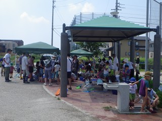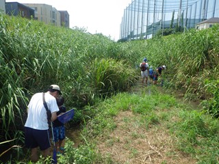 観察場所は平地川、稗田川が合流する親水公園(公園の名称ではない)の一角。本来この時期、この一角は身の丈ほどの葦(アシ=ヨシ)が繁茂し、とても川に入れるような状態ではない。従って今回も観察会開催のために広い面積の草刈りをしたところであった。また、この一角には屋根付き休憩所(あずま屋)と水道があるので大変都合のよいところでもあった。