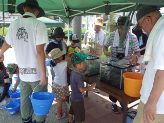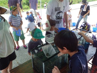川から上がって、つかまえた生きものを「魚類」と「魚類以外の生きもの」にそれぞれの水槽に分けて入れ、それぞれに分かれて生きものの説明。