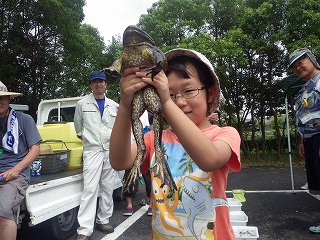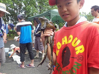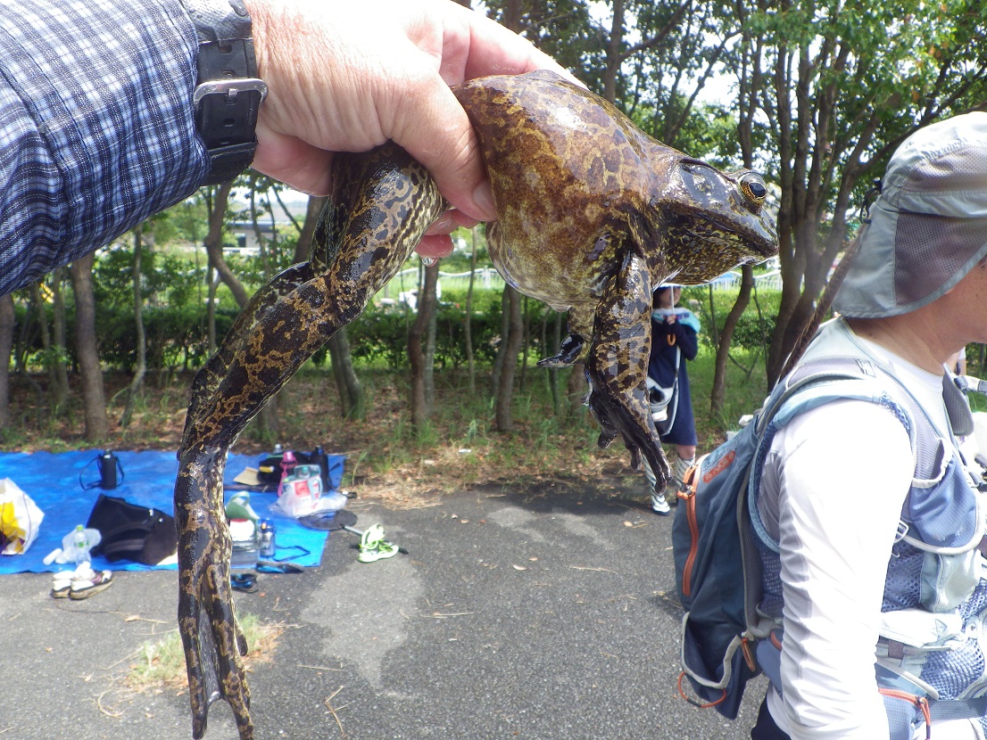 特に、大きなウシガエルのゲットは、正直言って、数十年ぶりの快挙であった。大きなウシガエルは市内の池や川にいることを疑ってはいないが、観察会活動では近年つかまえたことがなかった。そのため、掲載写真にあるとおり「ウシガエルとツーショット」を大々的にやってみた。(もちろん、特定外来生物との説明もあり)