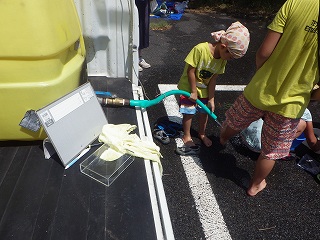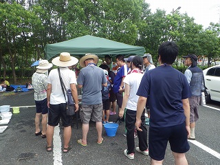 【左】解散後の一場面    【中】解散後の指導員研修…?   【右】主催者が準備した水タンク