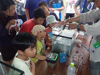 【左】採集場所の状況      【中】エビの説明   【右】説明会場の様子…子どもは最前列