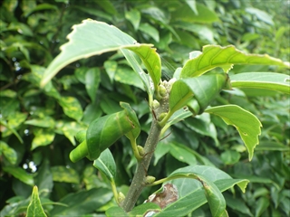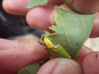 【左】アラカシの葉が巻かれているのを発見   【右】同左の巻かれた葉っぱの中を確かめた