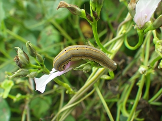 【左】道端のマメアサガオを食す幼虫   【中】同左の幼虫を観察          【右】ツチイナゴの脱皮を撮影中