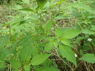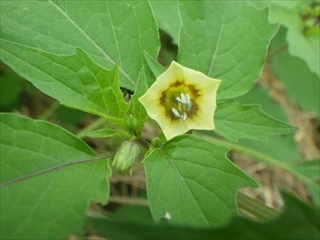 【左】道端のマメアサガオとフェンスのそれとを比較中 【中】ヒロハフウリンホオズキ 【右】同左の花の接写