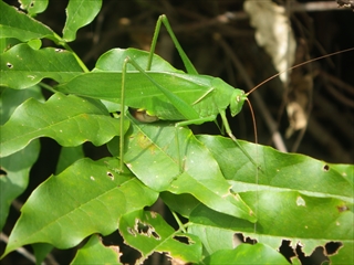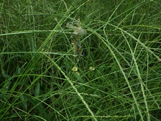 初めての発見とは、「ツチイナゴの脱皮」。コースの道端にメヒシバ群落があり、そこにツチイナゴがいっぱいいて、その中に、ちょうど脱皮中のものがいたのでした。(下記掲載写真の通り)