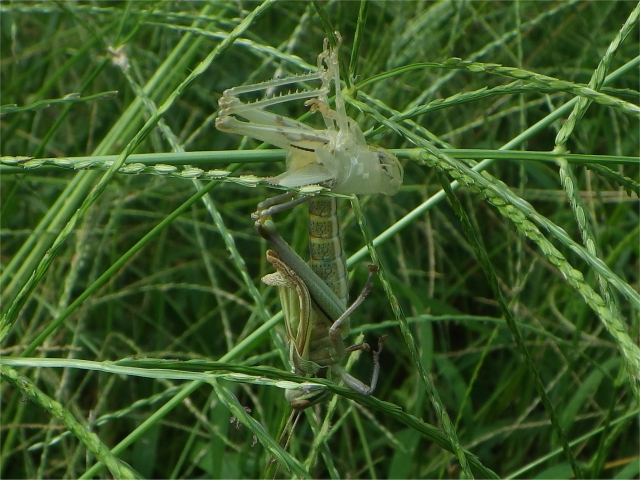 【左】メヒシバ群落に土イナゴがいっぱい。中には脱皮中のものが… 【右】脱皮中。写真クリック→ビッグサイズ