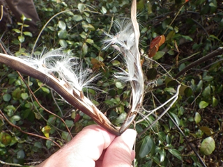 【左】テイカカズラの種子(綿毛)を観察 【右】越冬中のユミアシゴミムシダマシ(成虫)を説明している