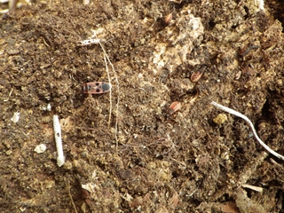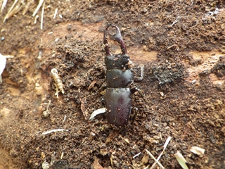 道筋沿いの倒木をつついてみると、成虫越冬らしいコクワガタやチビクワガタ、ユミアシゴミムシダマシをみつけることができた。温度が少し上がっているためか鈍いながらも少し動きが見られた。