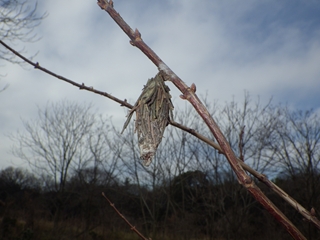 【左】オオカマキリの卵があちこちにあった 【中】ボクトウガの幼虫の抜け殻 【右】オオミノガのミノムシ。珍しい