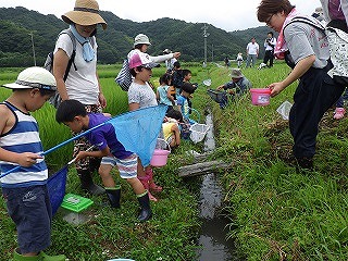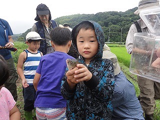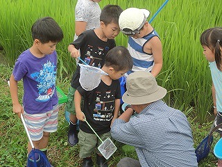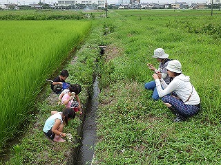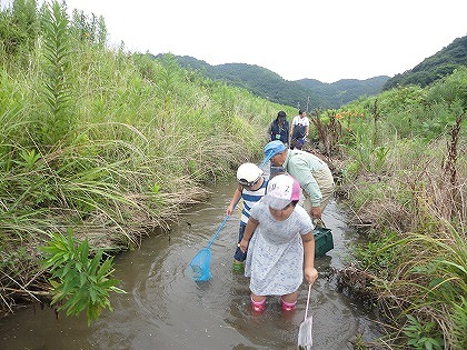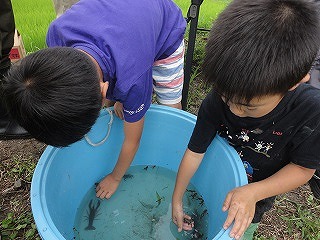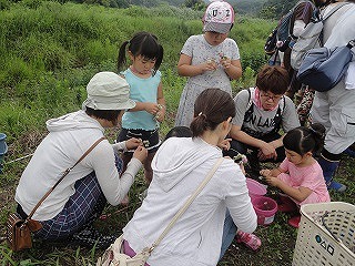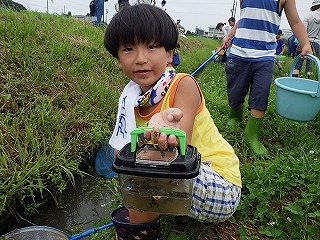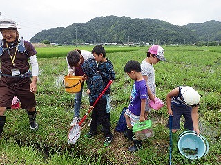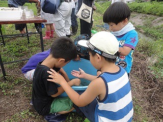 山海川までの用水路では、アメリカザリガニや変態したばかりの小さなカエルがたくさん見られ、子どもたちは夢中になって採集していました。M指導員のすくうタモ網の中の獲物が特に気になるのか、多くの子どもたちの注目の的となっていました。