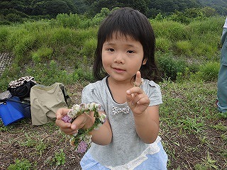 ふと、あぜ道を見ると「紫色のシロツメクサ」が咲いているのを見つけ、気になったので後で調べてみると、ムラサキツメクサ(紫詰草)、和名ではアカツメクサとも呼ばれ、一般的には赤クローバーと言われるそうです。参加したお母さん方により即席のシロツメクサの指輪と腕輪づくり教室が開催されるなど、思い思いの楽しみ方を見つけられた観察会だったと思います。(記:田中達)
