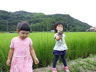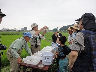 観察会開始の挨拶と予定説明ののち、山海川まで農道を歩きながら、途中途中の用水路で生き物の採集、草花や飛び交う昆虫などの観察をしながら山海川まで向かいました。周りの田んぼでは稲が順調に育っており、あぜ道ではシロツメクサが可憐な花を咲かせ、アオサギの飛翔も観察できました。