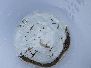 【左】 たくさん捕まえました 【右】指導員の見つけた生き物に興味津々