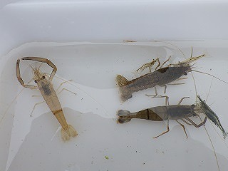 【左】カワアナゴ 【中】大きなウナギ 【右】ヒラテテナガエビなど