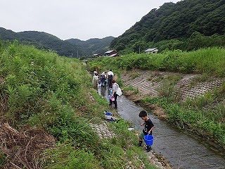 東海地方でもそろそろ梅雨明けかと言われ始め、たいへん暑い中、6家族18名の参加者があり、昨年に引続いて2回目の山海川生き物観察会が開催されました。今回の参加者は全て南知多町内からの参加でした。