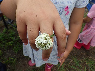 【左】 お母さんたちの腕輪づくり教室 【中】シロツメクサの指輪 【右】シロツメクサの腕輪