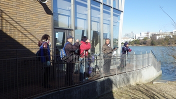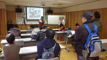 室内で出発前のガイダンス。本日は雁鴨(ガンカモ)の「カリ」「カモ」の違いは何かの解説の後、野外観察に出発。