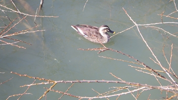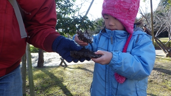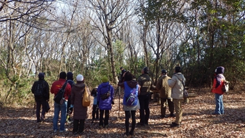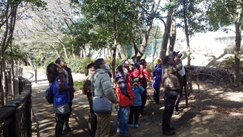 鳥の観察は、まず、デッキから水鳥を観察。続いて、林内の散策コースでの観察。梢で飛び交うメジロや地上のツグミを見ながら上の池に出る。