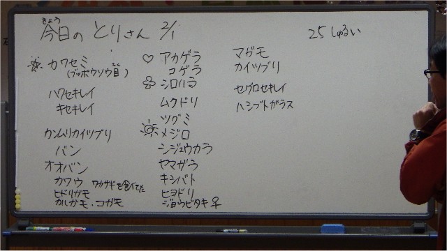 観察を終えて、部屋に戻り、一人ひとりが順番に見た鳥の名前を発表し、それを白板に記録して解散しました。