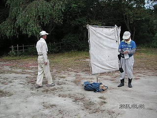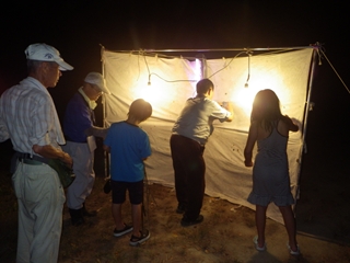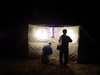 今日も37℃超の猛暑日。夕方になると幾分和らぐが、依然として汗が噴き出る。  18時30分 白布、灯具、発電機の設置し灯火観察の準備完了。